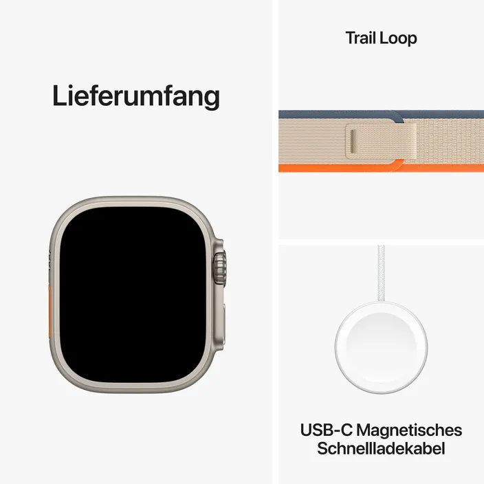 CO₂ NEUTRAL – Die Apple Watch Ultra 2 mit dem neuesten Alpine Loop oder dem neuesten Trail Loop ist CO₂ neutral. Weitere Infos zum Engagement von Apple für die Umwelt unter apple.com/de/2030.4