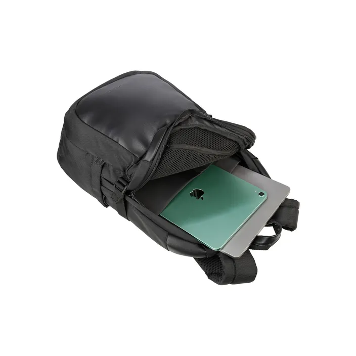 Business-Rucksack für 16-Zoll-MacBook Pro und Laptops bis 15,6 Zoll, hergestellt aus recyceltem Kunststoff und PU in Lederoptik, ausgestattet mit dem herstellereigenen AGS-System, einem elastischen Aufhängungssystem für die Schultergurte, das die Belastung von Schultern und Rücken deutlich reduziert. Sicherheitsfach mit Reißverschluss in der unteren Rückenseite, für bequemen Zugriff während des Tragens.