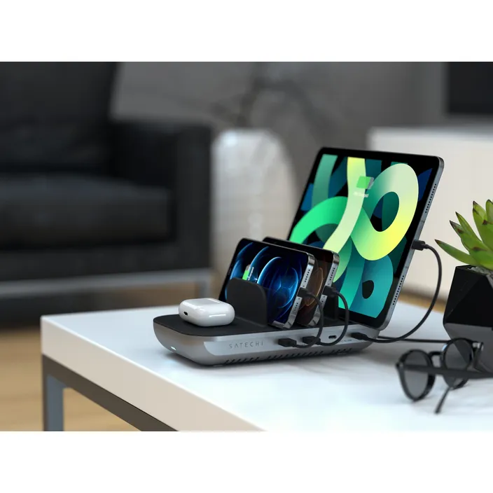 Egal ob am Arbeitsplatz, auf dem Küchentisch oder im Wohnzimmer – die Satechi Multi-Device Charging Station Dock5 hilft dabei, alle Geräte an einem Ort zu organisieren und gleichzeitig Kabelchaos zu vermeiden. Die Ladestation kann dank verschiedener Anschlüsse bis zu fünf Geräte gleichzeitig laden: Zwei USB-C-PD-Anschlüsse (mit einer Geschwindigkeit von bis zu 20 Watt pro Gerät), zwei USB-A-Anschlüssen (mit einer Geschwindigkeit von bis zu 12 Watt pro Gerät) und eine Qi-Ladefläche für qi-fähige Geräte (mit bis zu 10 Watt). Die Ladestation ist in den Zwischenräumen mit Silikon ausgekleidet, damit alle Geräte geschützt sind und Kratzer vermieden werden.