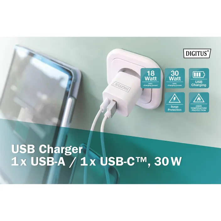 DIGITUS USB Ladegerät 1x USB-A / 1x USB-C, 30W