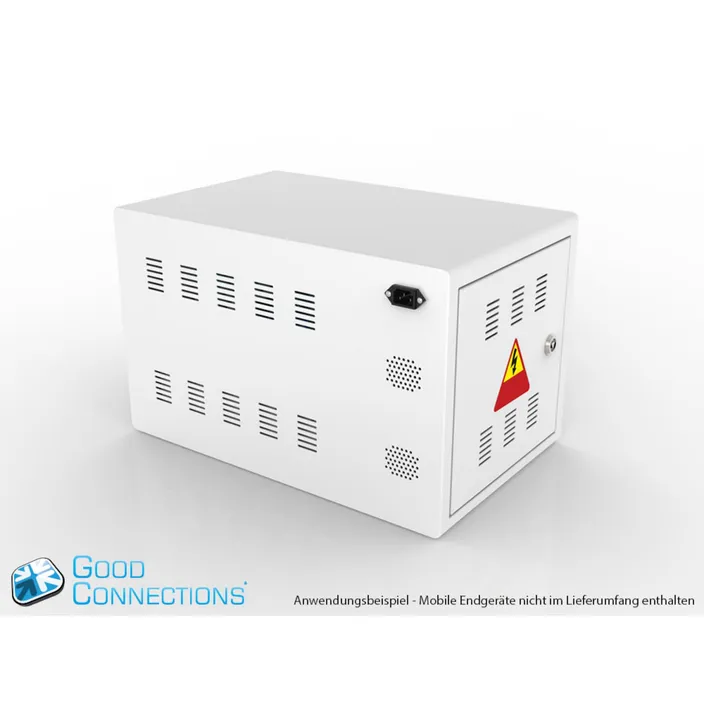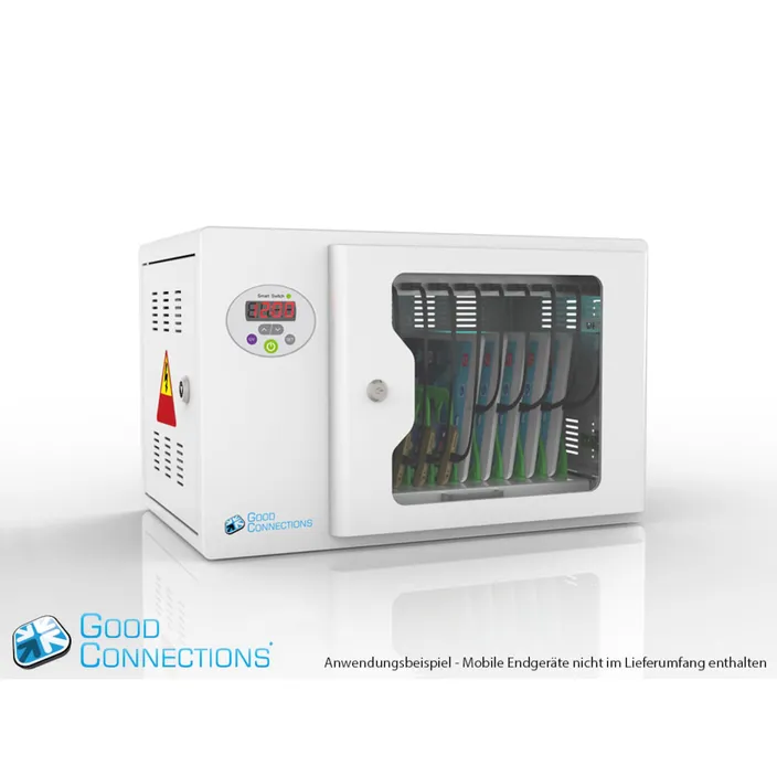 Mit dem innovativen Tablet-Ladewagen begleitet Sie Good Connections® auf den Weg der Digitalisierung und sorgt dafür, dass ihre Geräte immer einsatzbereit und geladen sind, wenn sie gebraucht werden. Sichere Aufbewahrung und energieeffiziente sowie ressourcenschonende Ladetechnik – durch seine Flexibilität und Vielseitigkeit ist der UL-zertifizierte Tablet-Ladewagen von Good Connections® der ideale Begleiter für Ihr Projekt im Bildungswesen, Gesundheitswesen, Industrie, Tagungsstätten, Hotels und der Gastronomie. Machen Sie sich keine Gedanken mehr darüber ob Sie das passende Ladegerät für ihr Tablet zur Hand haben, denn durch die USB-Ports mit intelligenter IC-Ladesteuerung benötigen Sie nur noch eine Standard-Steckdose für bis zu 65 Tablets. Eine in jeder Ladeebene angebrachte UV-C Lampe sorgt umweltfreundlich und ohne Chemie für sterilere Verhältnisse und eine verbesserte Hygiene. Die ausziehbaren und nummerierten Fächer dienen der einfachen Zuordnung der Geräte zu den einzelnen Nutzern.