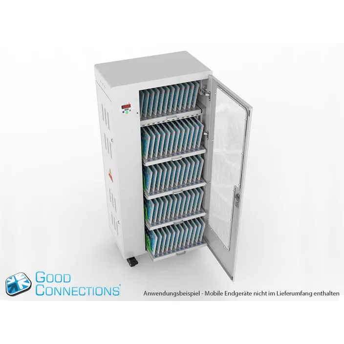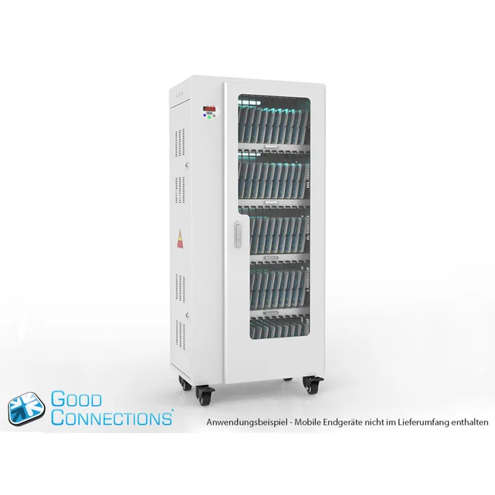 Mit dem innovativen Tablet-Ladewagen begleitet Sie Good Connections® auf den Weg der Digitalisierung und sorgt dafür, dass ihre Geräte immer einsatzbereit und geladen sind, wenn sie gebraucht werden. Sichere Aufbewahrung und energieeffiziente sowie ressourcenschonende Ladetechnik – durch seine Flexibilität und Vielseitigkeit ist der UL-zertifizierte Tablet-Ladewagen von Good Connections® der ideale Begleiter für Ihr Projekt im Bildungswesen, Gesundheitswesen, Industrie, Tagungsstätten, Hotels und der Gastronomie. Machen Sie sich keine Gedanken mehr darüber ob Sie das passende Ladegerät für ihr Tablet zur Hand haben, denn durch die USB-Ports mit intelligenter IC-Ladesteuerung benötigen Sie nur noch eine Standard-Steckdose für bis zu 65 Tablets. Eine in jeder Ladeebene angebrachte UV-C Lampe sorgt umweltfreundlich und ohne Chemie für sterilere Verhältnisse und eine verbesserte Hygiene. Die ausziehbaren und nummerierten Fächer dienen der einfachen Zuordnung der Geräte zu den einzelnen Nutzern.