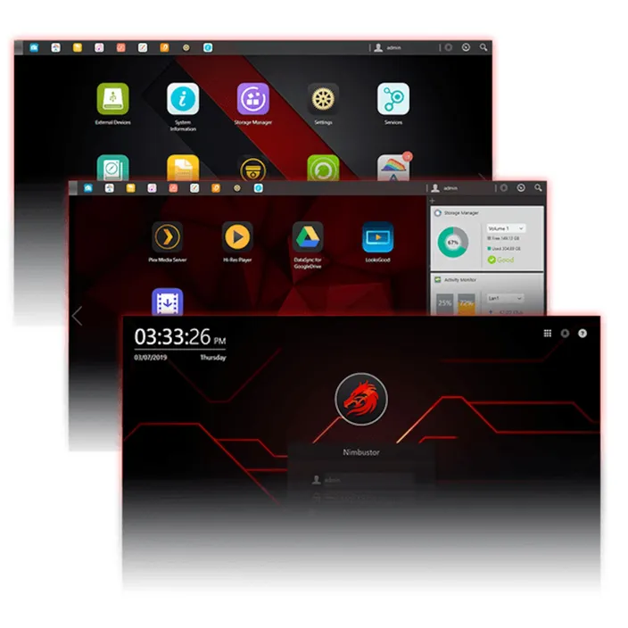Diamantgeschliffenes Gehäuse mit Gaming-inspirierten Elementen. Das Nimbustor von ASUSTOR besitzt ein diamantgeschliffenes Gehäuse in einem neuen, Gaming-inspirierten Look. Die Installation der Laufwerke wird durch die mitgelieferten werkzeuglosen Festplattenrahmen erleichtert. Zusätzlich können die Festplatten auch im laufenden Betrieb ausgetauscht werden.