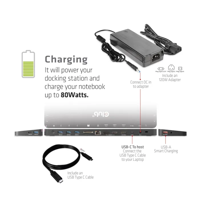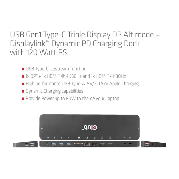Die Club 3D CSV-1566 USB Gen1 Typ-C Triple Display DP™ Alt Modus + Displaylink™/USB Modus™ Dynamic PD Ladedock mit 120 Watt Netzteil, ist eine integrierte Lösung, die Video, Daten, Strom, Ethernet und Audio kombiniert. Diese Docking Station ist perfekt geeignet um die Möglichkeiten Ihres Typ-C Ports oder USB-A-Ports (über einen Typ-C auf USB-A-Konverter) zu erweitern über mehrere Audio, Video, Daten und Stromanschlüsse. Sie liefert die ideale Lösung für Nutzer, die viele Anschlussmöglichkeiten suchen. Diese Dock hat 3 Videoausgänge (2 HDMI™, einen von DP™1.2 Alt Modus, einen vom USB Modus, 1 DisplayPort™ vom USB Modus) für Videonutzung, 4 USB Gen1 Typ-A und 1 USB Gen1 Typ-C für Datenübertragung, RJ45 für super schnelles Ethernet, SD/TF Kartenslots zur Verwendung von Speicherkarten. Darüber hinaus, hat sie einen smarten Ladeport, der schnelle Ladeleistung für die angeschlossenen mobilen Geräte (Apple,Samsung Smartphones, Pads,etc) liefert. Ein 120W Netzteil wird mitgeliefert um Strom für die Funktionalität der Dock bereitstellt und den Host mit maximal 80W (20V/4A) lädt. Diese Dock hat ein Tisch-Design, so dass sie unter dem Host platziert werden kann. Die Docking Station funktioniert mit von DP™1.2 Alt Modus unterstützten USB-Typ-C und -A Hosts.