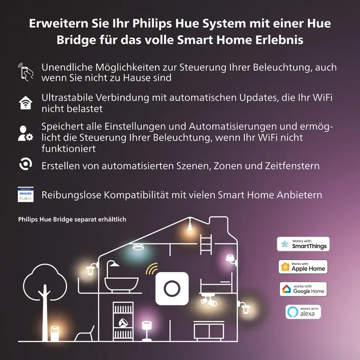 Erlebe das gesamte Spektrum der Philips Hue Funktionen mit einer Hue Bridge noch intensiver: Mit einer Hue Bridge kannst Du bis zu 50 smarte Philips Lampen in Deinem ganzen Zuhause verwenden. Erstelle Timer und Routinen, um Dein gesamtes Smart Home Lichtsystem automatisch zu steuern und verwende Deine Lampen, um natürlich aufzuwachen oder schlafen zu gehen. Steuere Deine Lampen, auch wenn Du nicht zuhause bist oder füge Zubehör wie Bewegungssensoren und smarte Schalter hinzu.
