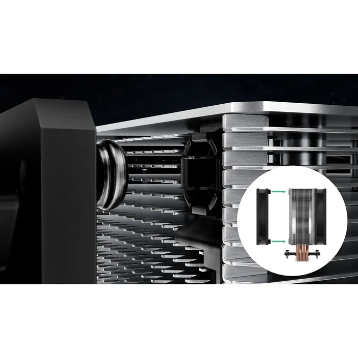 Die Finnen der Heatsink sind seitlich geöffnet und ermöglichen es dem Pull-Lüfter, zusätzlich kühle Luft aus dem Gehäuse durch den Kühlkörper zu ziehen. Durch dieses Side-Flow-Design wird eine noch effizientere Belüftung erreicht.