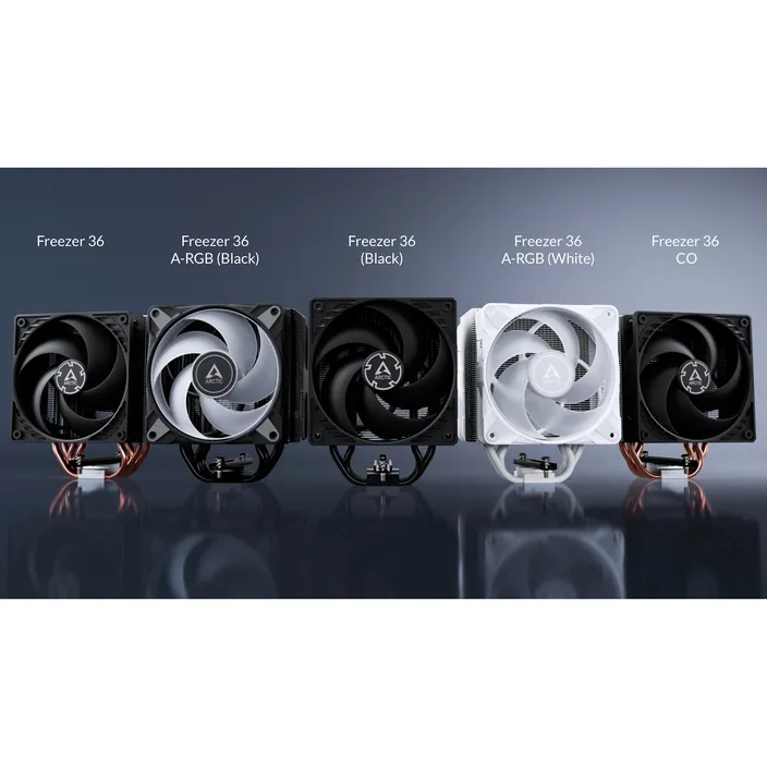 Der Freezer 36 ist in fünf verschiedenen Ausführungen erhältlich, alle Varianten sind mit zwei Lüftern in Push-Pull-Konfiguration ausgestattet. Neben dem Standardmodell mit Aluminium-Heatsink-Design ist eine Variante mit schwarzer Heatsink verfügbar. Für den Dauerbetrieb gibt es außerdem die CO-Version, die mit Lüftern mit doppelten Kugellagern ausgestattet ist. Alternativ können Nutzer zwischen einer schwarzen und einer weißen Version mit A-RGB-Lüftern wählen.