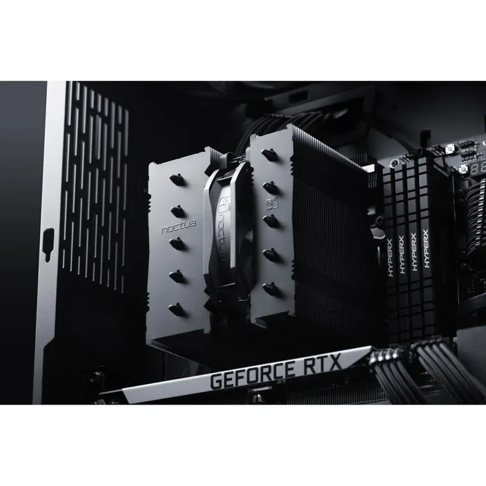 Mit einer Höhe von nur 145mm (13mm niedriger als die klassischen 120mm Noctua-Modelle) passt der NH-D12L chromax.black in zahlreiche 4HE Systeme sowie schmalere Tower-Gehäuse, die bisher auf Lösungen mit 92mm-Lüfter beschränkt waren. Zugleich erreicht er dank seines Dual-Tower-Designs mit fünf Heatpipes und dem richtungsweisenden 120mm-Lüfter NF-A12x25r ein Leistungsniveau, das viele 120mm-Modelle mit voller Bauhöhe übertrifft. Dank der Einzellüfter-Konfiguration und der asymmetrischen Konstruktion ragt der NH-D12L auf AMD AM5/AM4 und Intel LGA1851/1700/1200 nicht über die Speicher-Slots und bietet daher 100% RAM-Kompatibilität.