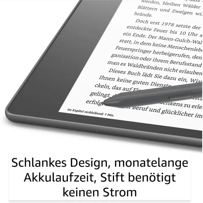 - StromversorgungAkkulaufzeit:Eine einzige Akkuladung hält bis zu 12 Wochen, basierend auf einer halben Stunde Lesezeit pro Tag bei ausgeschalteter Drahtlosverbindung und Bildschirmhelligkeit 13. Beim Schreiben hält eine einzige Akkuladung bis zu 3 Wochen, basierend auf einer halben Stunde Schreiben pro Tag bei ausgeschalteter Drahtlosverbindung und Bildschirmhelligkeit 13. Die Akkulaufzeit variiert und kann von der Nutzung und anderen Faktoren abhängen, beispielsweise aufgrund des Streamens von Audible-Hörbüchern und des Schreibens von Notizen für Inhalte.Ladezeit:Lässt sich über ein mit einem Computer verbundenes USB-C-Kabel innerhalb von etwa 7 Stunden voll aufladen. Mit einem 9-W-USB-C-Netzteil beträgt die Ladezeit etwa 2,5 Stunden.