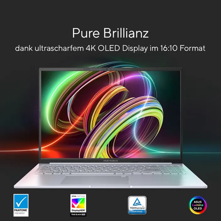 Dynamische Bewegungen, lebendige Farben, klare Bilder bei jeder Helligkeit, weniger schädliches Blaulicht und ein nie dagewesenes Schwarz sind nur einige der Vorteile eines OLED Displays. Das 16 Zoll Display des Vivobook 16X OLED mit ultrascharfen 4K bietet all das. Dank des großen 16:10 Formats mit fantastischen 3840 x 2400 Pixeln, einer schnellen Reaktionszeit von 0,2ms und einem Screen-to-Body Verhältnis von 87% hast Du nicht nur alles im Blick, sondern genießt Deine Lieblingsserien und -filme auch in den schönsten Farben - überall und jederzeit.