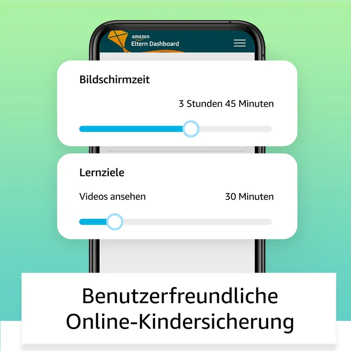 Mit der Kindersicherung können Bildschirmzeiten begrenzt, Lernziele und Schlafenszeiten festgelegt und bis zu 4 Kinderprofile verwaltet werden. Mehr zum Amazon Eltern Dashboard.