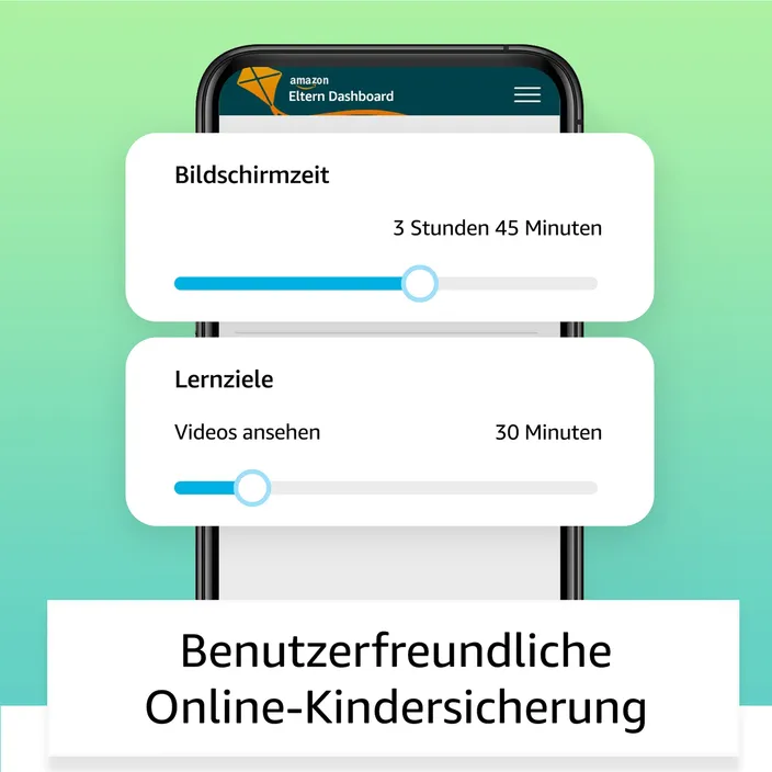 Mit der Kindersicherung können Bildschirmzeiten begrenzt, Lernziele und Schlafenszeiten festgelegt und bis zu 4 Kinderprofile verwaltet werden. Mehr zum Amazon Eltern Dashboard.