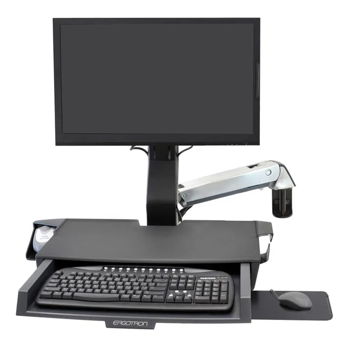 Lassen Sie die Betreuer in Ihrer medizinischen Einrichtung sitzend und stehend arbeiten, mit allem zur Hand, was sie brauchen. Dieser Sitz-Steh-Kombiarm hält Monitor, Barcodescanner, Tastatur, Handballenauflage und Maus sowie eine stabile Arbeitsfläche auf demselben höhenverstellbaren Arm für eine ergonomische Passform, die die besten Arbeitsabläufe (und den besten Komfort) unterstützt.