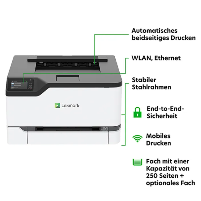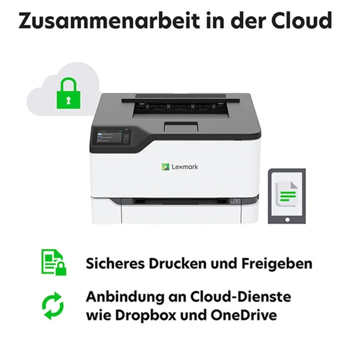 Verleihen Sie jeder kleinen Arbeitsgruppen eine brillante, konsistente Farbausgabe mit dem kompakten, leichten Lexmark C3426dw. Dieser Drucker wurde auf Zuverlässigkeit, Leistung und Sicherheit ausgelegt. Er druckt bis zu 24 Seiten/min* und bietet eine erweiterbare Zuführung für längere Druckaufträge. Übernehmen Sie die Kontrolle mit einem 7,2-cm-Touchscreen und stellen Sie über WLAN, USB, Ethernet oder die Cloud eine Verbindung her.