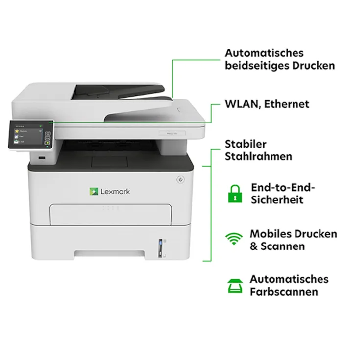 Das Lexmark MB2236i MFP mit seiner Schwarzweiß-Druckgeschwindigkeit von bis zu 34 Seiten/Min. bietet darüber hinaus WLAN, einen USB-Anschluss an der Vorderseite und einen e-Task-Touchscreen.