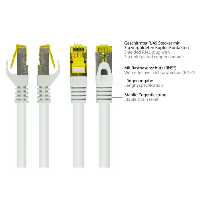 Patchkabel von Good Connections® mit effektivem Rastnasenschutz (RNS®). Der Rastnasenschutz (RNS®) verhindert das Wegknicken der Rastnase auf dem Patchkabelstecker. So gehören abgebrochene Rastnasen der Vergangenheit an!