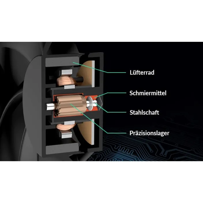 Dank einer in Deutschland entwickelten Kombination von Legierung/Schmiermittel wird die Reibung innerhalb des Lagers reduziert und eine höhere Effizienz erzielt. Auf diese Weise entwickelt sich weniger Wärme, es entstehen weniger Lagergeräusche und die Lebensdauer des Lüfters wird verlängert.