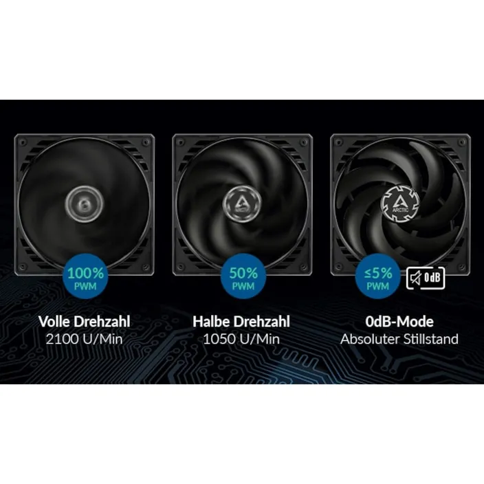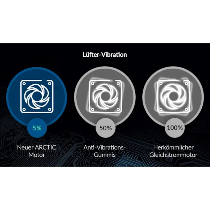 Das Betriebsgeräusch des neu entwickelten ARCTIC Motors ist selbst bei geringster Drehzahl kaum wahrnehmbar. Der Motor der P-Lüfter erzeugt dank Sinus-Magnetisierung nur 5 % der Kommutationsschwingungen eines herkömmlichen Gleichstrommotors. Somit besteht dank der gleichmäßigen Kraftverteilung kein Bedarf an einer Gummipufferung.