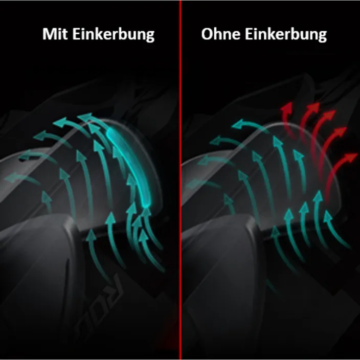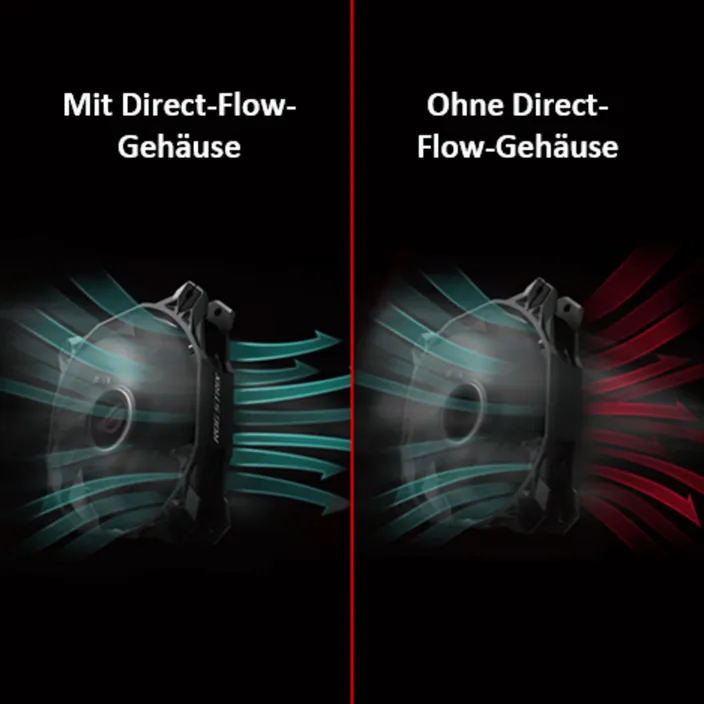 Der Winkel und die Krümmung der Gehäuseverstrebungen wurden so gestaltet, dass sie den Luftstrom in eine Richtung lenken und kanalisieren, so dass ein hochkonzentrierter Airflow entsteht. Diese Bauweise minimiert Verwirbelungen und erhöht den statischen Druck durch einen fokussierten Luftstrom