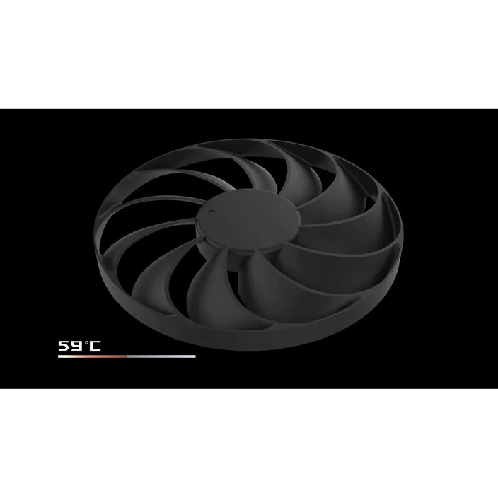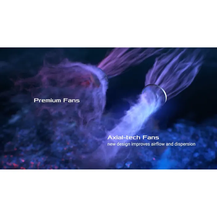 Ein sorgfältig entwickeltes Shroud-, Kühlkörper- und Heatpipe-Layout ermöglicht es den beiden Axial-Tech-Lüftern, die Belüftung der Seitenwand des Gehäuses zu nutzen und eine Wärmeleistung zu erzielen, die die Größe der Karte nicht vermuten lässt.