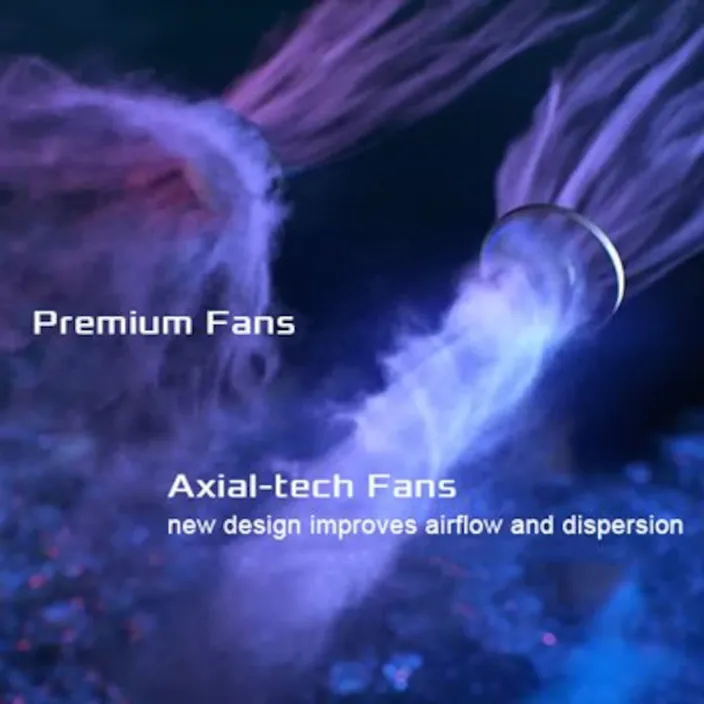 Das Axial-Tech-Lüfterdesign hat eine kleinere Nabe, die längere Flügel ermöglicht, und einen Sperrring, der den Luftdruck nach unten erhöht.