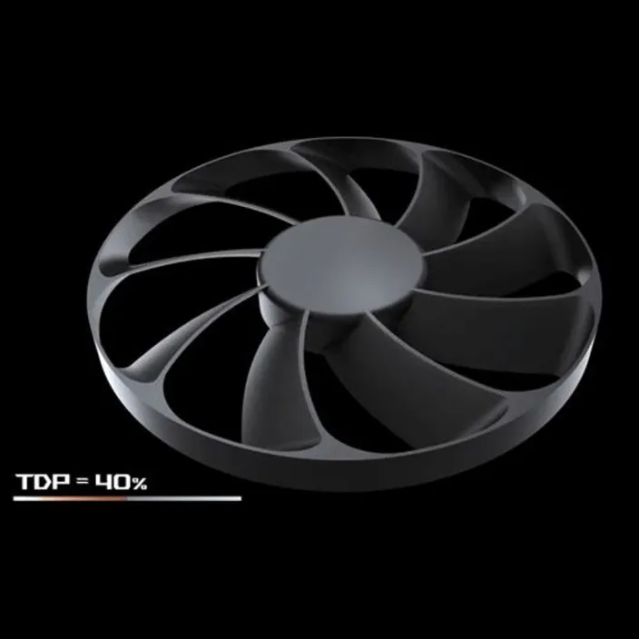 Ein integrierter Controller bringt den 135-mm-Lüfter zum Stillstand, wenn die Gesamtleistungsaufnahme (TDP) unter 40% liegt, damit du weniger anspruchsvolle Spiele in relativer Stille genießen kannst. Wenn die Temperatur über 40% der TDP steigt, werden die Lüfter automatisch wieder gestartet.