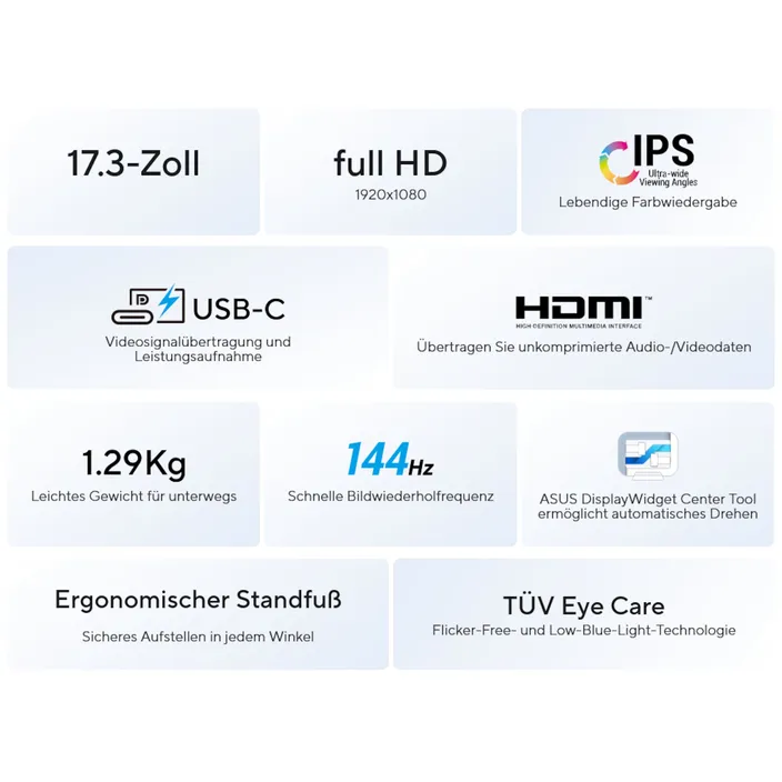 ASUS ZenScreen MB17AHG tragbarer Monitor - 17 Zoll (17,3 Zoll sichtbar) FHD (1920 x 1080) IPS-Panel, 144 Hz , SmoothMotion Technologie, L-förmiger Kickstand, Stativ , USB Typ-C®, HDMI®, Flicker Free, Low Blue Light, FSC