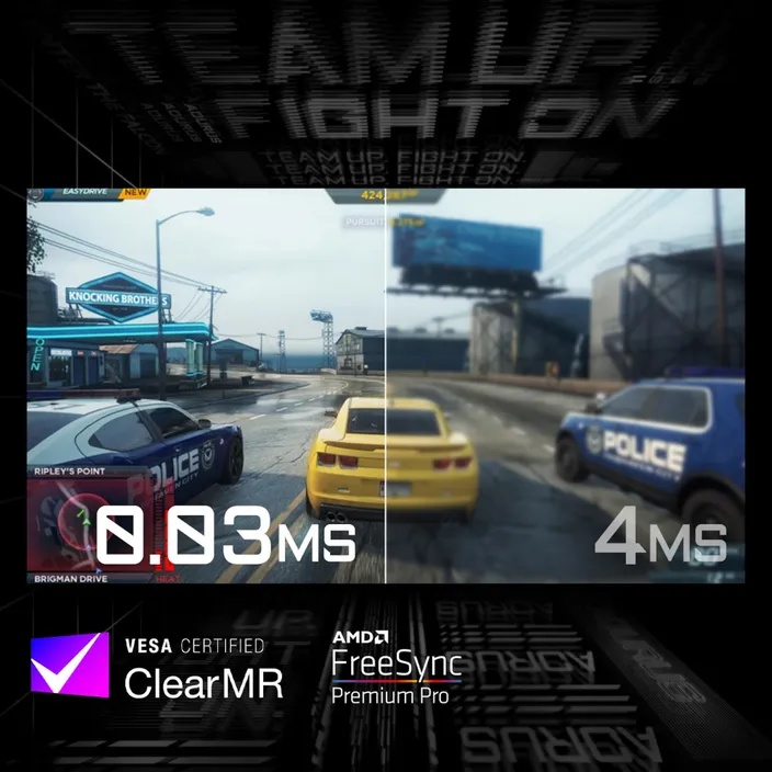 Der mit ClearMR 8000 zertifizierte OLED-Gaming-Monitor AORUS CO49DQ reduziert die Reaktionszeit auf nur 0,03ms GTG und bietet somit klare Darstellungen mit geringer Bewegungsunschärfe hinter sich schnell bewegenden Motiven.