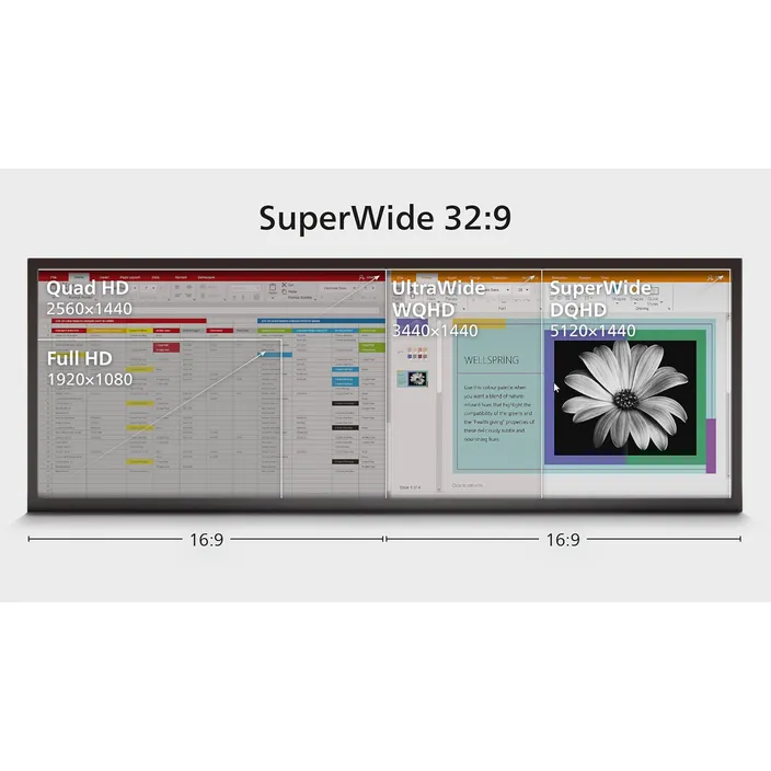 Unser 124 cm (49") SuperWide-Bildschirm mit einer Auflösung von 5.120 x 1.440 Bildpunkten wurde entwickelt, um mehrere Bildschirme durch eine beeindruckend breite Ansicht zu ersetzen. Er bietet eine Anzeige wie zwei 69 cm (27") Quad HD-Displays im Format 16:9 nebeneinander. SuperWide-Monitore ermöglichen den gleichen Bildschirmbereich wie zwei Monitore, aber ohne komplizierte Einrichtung.