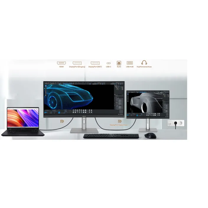 Zusätzlich zu USB-C bietet das ProArt-Display eine Vielzahl von Anschlussmöglichkeiten wie HDMI®, DisplayPort™ (mit Daisy-Chain-Unterstützung), USB Typ-A und einen zusätzlichen USB-C Downstream-Anschluss für die Kompatibilität mit einer Vielzahl von Geräten. Mit DisplayPort können Sie mehrere Bildschirme von einer einzigen Videoquelle aus in Reihe schalten und so die Produktivität steigern. Der PA34VCNV verfügt sogar über einen RJ45-Ethernet-Anschluss, über den angeschlossene Geräte eine stabile Internetverbindung aufbauen können. Außerdem verfügt er über einen Pass-Through-Anschluss für den Kopfhörereingang.