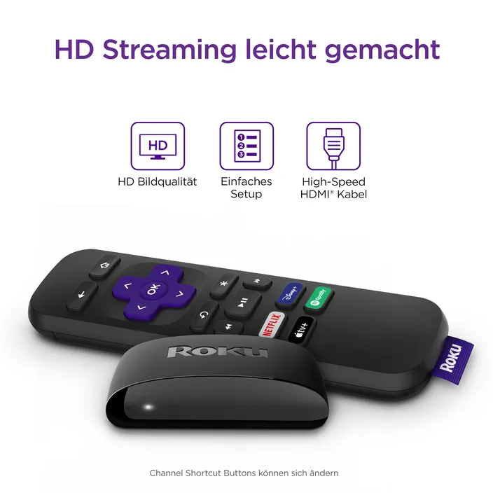 Mit Roku Express kannst du streamen, was dir gefällt - Filme, Live-Nachrichten, Sport und mehr. Das Setup auf deinem Fernseher ist mit dem mitgelieferten HDMI® Kabel ganz leicht. Die Fernbedienung mit Kurzbefehltasten zu vorprogrammierten Channels und das übersichtliche Interface erlauben dir, deine Favoriten wie Netflix, YouTube, Prime Video, Disney+, ARD, Sky Ticket, DW und viele andere schnell zu finden. Schaue an, was du willst – zahle, was du nutzt. Keine monatlichen Gerätegebühren oder Verträge. Finde ganz schnell heraus, wo du Filme und Shows kostenlos oder zu den günstigsten Preisen streamen kannst. Die Suchergebnisse sind nach Preis geordnet und mit einem Klick aufrufbar. Die kostenlose Roku Mobil-App (iOS® & Android™) bietet weitere Funktionen wie Audio via Kopfhörer, die Übertragung von Fotos und Musik auf deinen Fernseher und eine integrierte Fernbedienung.