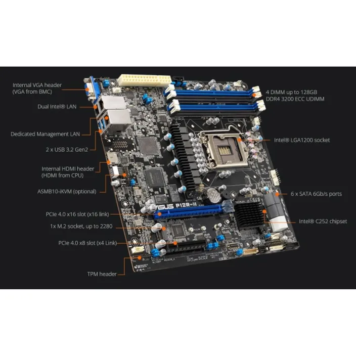 Intel® Xeon® E-2300 LGA 1200 Micro-ATX server motherboard with four DIMM and one M.2 slot, plus dual LAN, six SATA, one HDMI, two PCIe 4.0 slots, two USB 3.2 Gen 2, Platform Firmware Resilience (PFR) and ASUS ASMB10-iKVM