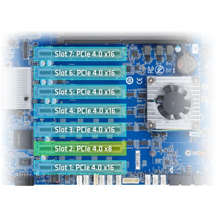 7x PCIe x167x PCIe 4.02 x M.2 slot for storage:- M-key- PCIe Gen4 x4 or 4x SATA 6Gb/s- Supports NGFF-2242/2280 card1 x M.2 slot for Wi-Fi:- E-key- Supports NGFF-2230 card3 x U.2 connector:- SlimSAS type- PCIe Gen4 x4 or 4x SATA III 6Gb/s
