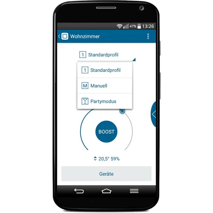 Manuelle Bedienung: Temperaturänderungen und Auslösen der Boost-Funktion (schnelles Aufheizen des Heizkörpers) direkt am Gerät möglich.