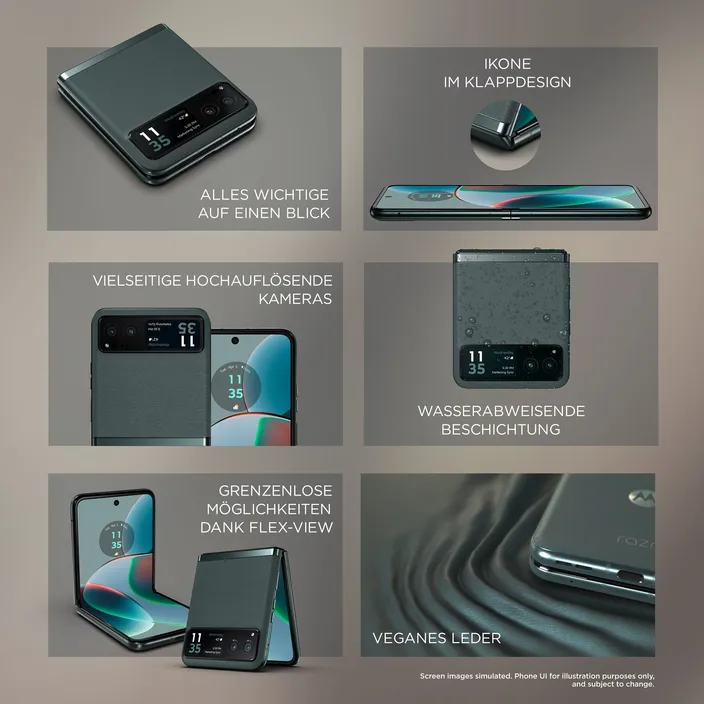Entdecke das brandneue motorola razr40 im superstylishen, kompakten Flip-Design. Mit seinem veganen Leder-Finish und in vielen coolen Farben erhältlich setzt das motorola razr40 neue Maßstäbe für Smartphones. Entdecke neue Möglichkeiten zum Interagieren, Fotografieren und Kreativsein mit deinem Smartphone, das du in verschiedenen Winkeln aufgeklappt hinstellen kannst. Bleib auch bei zugeklapptem Smartphone immer up-to-date – ein Blick auf deine Benachrichtigungen auf dem Außendisplay genügt. Klapp es auf und schon tauchst du dank dem ultraflüssigen, brillanten 6,9"-pOLED-Display und multidimensionalem Sound tief in dein Entertainment ein. Zusammen mit den hochauflösenden 64-MP- und 32-MP-Kameras und sensationeller Akkulaufzeit hast du ein Smartphone, das seinesgleichen sucht. Erwarte das Unerwartete vom neuen motorola razr40.