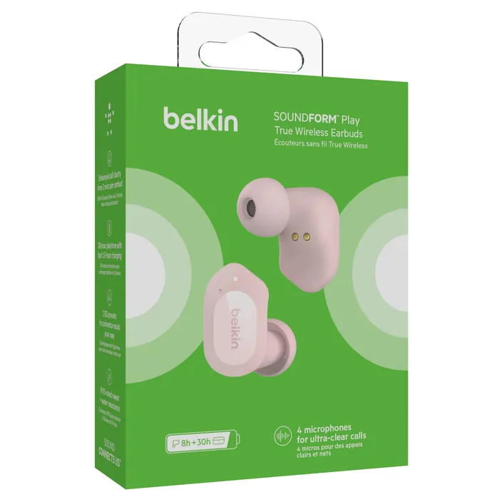 Genießen Sie mit dem robusten SOUNDFORM Play True Wireless In-Ear-Kopfhörer klaren und ausgewogenen Sound. Da dieser Kopfhörer über zwei Mikrofone in jedem Ohrhörer, einen speziellen von Belkin entwickelten Algorithmus zur Geräuschunterdrückung und drei EQ-Voreinstellungen verfügt, verstärkt er die Klänge, die Sie hören möchten, aber unterdrückt störende Geräusche. Nach dem Aufladen sorgt der Akku für bis zu acht Stunden Betriebszeit, die über das USB-C-Ladecase sogar auf 38 Stunden verlängert werden kann. Das bedeutet, dass Sie den Kopfhörer wirklich rund um die Uhr nutzen können. Da der SOUNDFORM Play In-Ear-Kopfhörer, der in vier stylischen Farben erhältlich ist, entsprechend der Schutzart IPX5 spritzwassergeschützt ist und sich deshalb für Workouts und jede Wetterlage eignet, ist er der perfekte Begleiter im Alltag.
