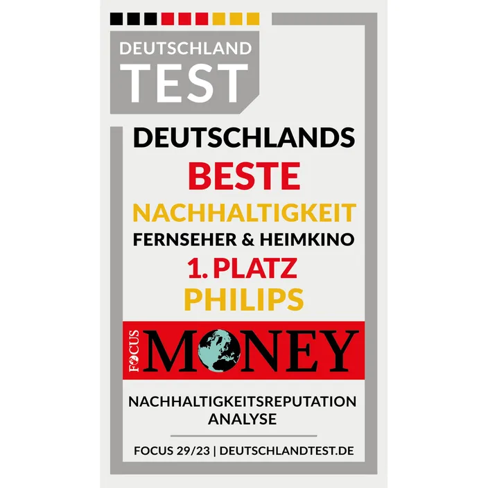 Der nahezu rahmenlose Bildschirm dieses Smart TVs passt zu praktisch jedem Einrichtungsstil. Die schlanken, dunkelgrauen Standfüße erwecken den Eindruck, als würde der Bildschirm schweben. Unsere Verpackungen bestehen aus FSC-zertifiziertem Recyclingkarton und unsere Druckerzeugnisse aus Recyclingpapier.