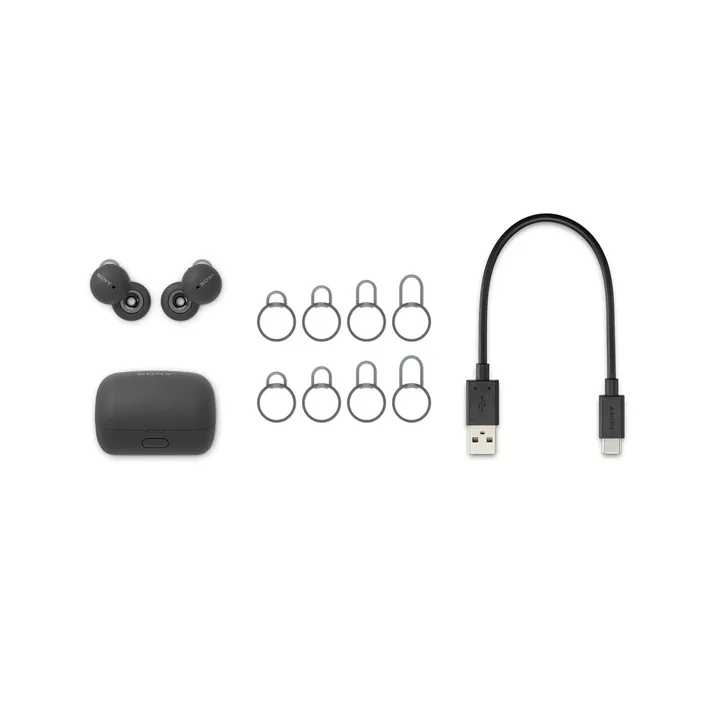 In der Verpackung Ihrer LinkBuds befinden sich Ohrbügel in fünf Größen für verschiedene Ohrformen sowie ein USB-C-Ladekabel.