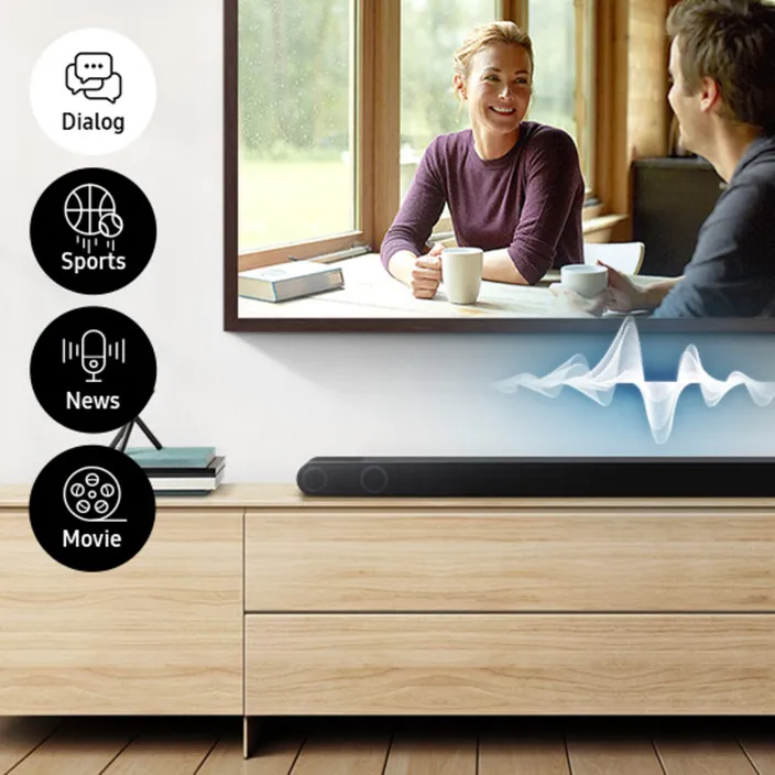 Dank Adaptive Sound wird der Sound auf deine Lieblingsinhalte angepasst. Die Samsung Soundbar analysiert die Tonspur und liefert automatisch Szene für Szene optimierten Sound. So kannst du Dialogen auch in leisen Szenen optimal folgen. Ebenso angepasst wird der Sound bei packenden Filmen, dynamischen Sportszenen und interessanten Nachrichten.