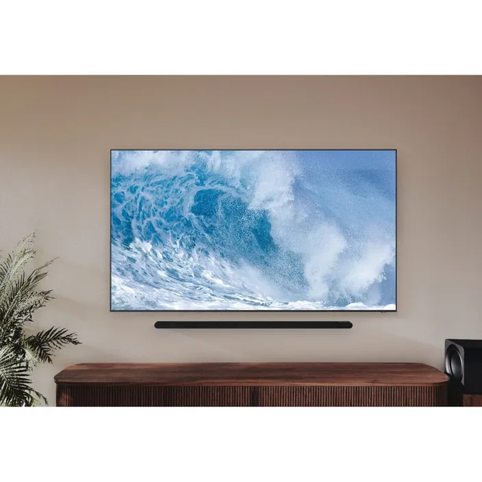 Die Soundbar überzeugt mit einem ultraschlanken, eleganten Design, welches ideal zu wandmontierten TVs passt und die Ästhetik ihres Heimkinos in keinster Weise beeinträchtigt.