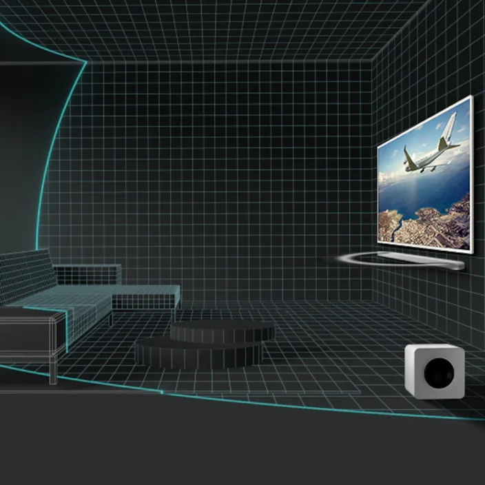 Die SpaceFit-Sound-Technologie in der Soundbar scannt täglich automatisch seine Umgebung, ganz unabhängig von deinem TV Modell. Dabei erkennt die Soundbar die Form, Größe und sogar die Einrichtung deines Zimmers, um den Klang optimal auf deinen individuellen Raum zu kalibrieren und anzupassen.