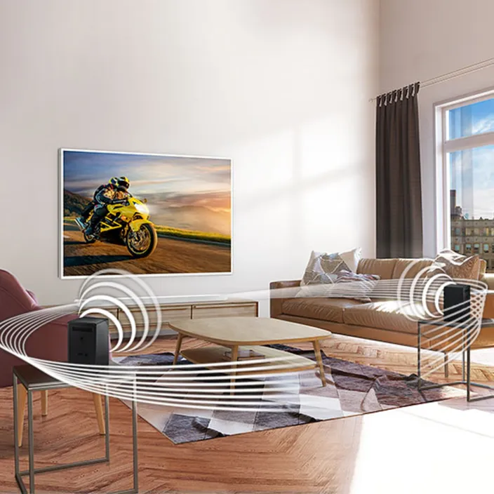 Genieße die Harmonie zwischeSamsung TV und Soundbar. Q-Symphony sorgt dafür, dass alle Lautsprecher des TVs und der Soundbar perfekt aufeinander abgestimmt werden und den Sound gleichzeitig aus beiden Geräten wiedergeben. Das erzeugt einen überzeugenden Surround-Effekt, ohne dass man die Fernsehlautsprecher stumm stellen muss.